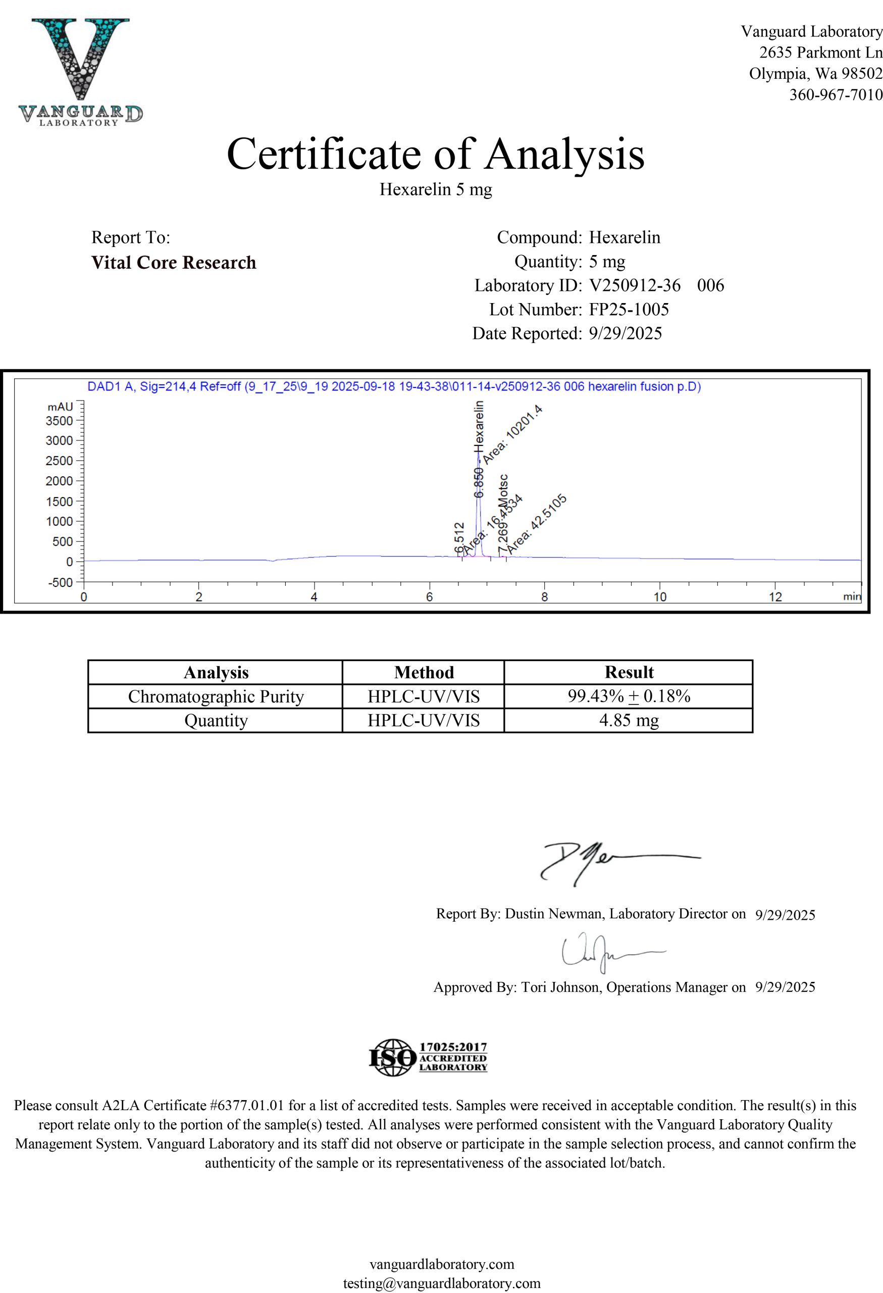Hexarelin is now available. Vital Core Research reviews every batch carefully because we ensure that each product is properly produced to include proper appearance and high purity.