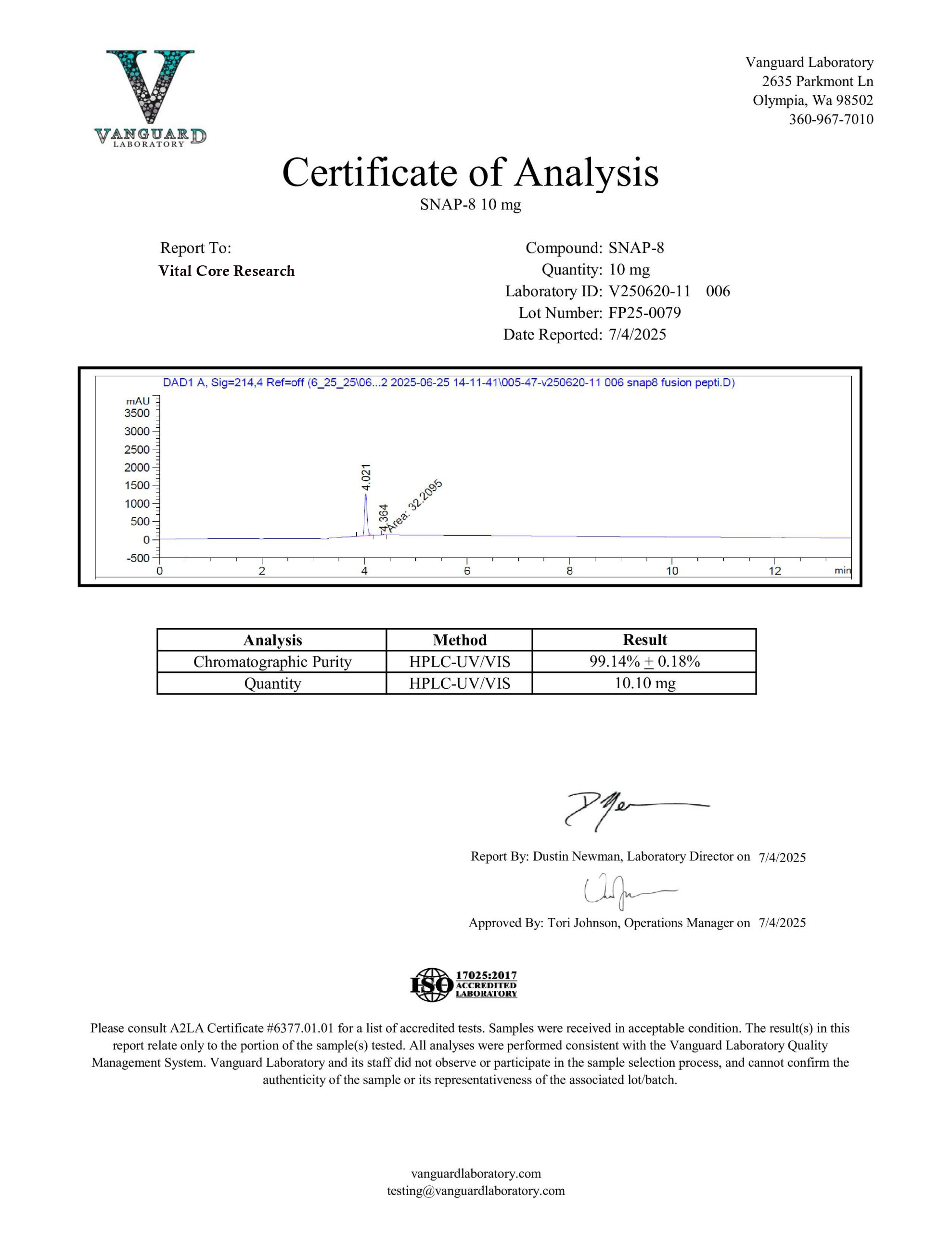 Purchase & earn 50 points!SNAP-8 is now available. Vital Core Research reviews every batch carefully because we ensure that each product is properly produced to include proper appearance and high purity.